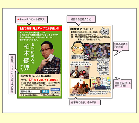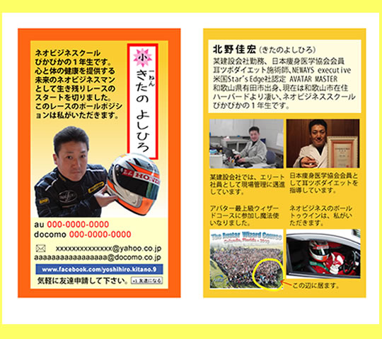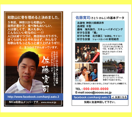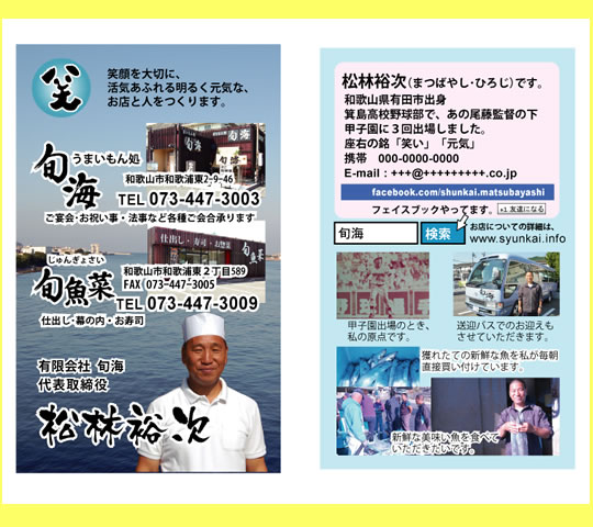 ■こんな感じで名刺を作ります。 参考にしてくださいね。 地元の居酒屋「旬海」の、松林社長の名刺です。 ここは何と言っても、社長が毎朝買い付ける旬の魚が売り物です。 その迫力の買い付けの現場を取材させていただきました。 また、和歌山では知らない人はいないと言う、伝説の甲子園ゲームにも参加されていたと言う、 ツイてる社長です。 新しいビジネスを創出するという意気込みで、「ネオビジネススクール」に入学した北野さんです。 昼間はサラリーマンなので、プロフィールの公表は敢えて控えめです。 この名刺はそのスクールの入学式に配るのをイメージして作らせていただきました。 イベントのその日のみ、1日限定名刺というのもありです。 佐藤さんもサラリーマンです。県外から配属で和歌山に来られました。 着任してみて、和歌山にすっかりほれ込んでしまったと言う佐藤さんの名刺です。 和歌山を盛り上げたいという思いを表現させていただいています。 ---------------------------------------------------------------- こんな感じで、あなたのオリジナルの名刺をも作らせていただきます。